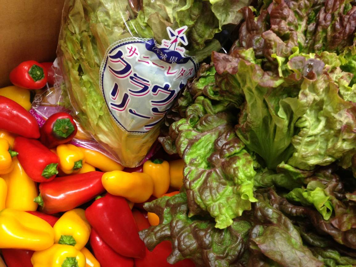 神栖市の「アグリニューウィンズ」さんから届いた野菜。クラウンリーフとスイートカクテルペッパー。美味いです。