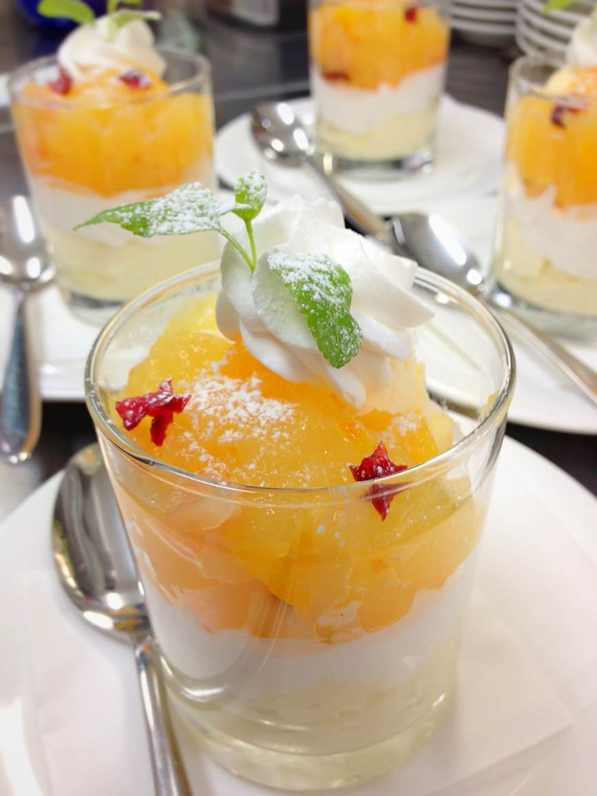 本日のランチセットのドルチェの一つ、「バニラのババロアとかんきつジュレのパフェ」 バニラ香る濃厚なババロアと、オレンジとグレープフルーツの爽やかなジュレとバニラアイスの組み合わせです。